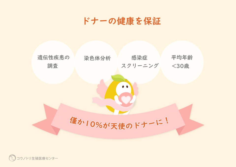 当院では、思いやりのある卵子ドナーの方々全員に対し、遺伝に関する家族歴の確認、染色体検査、感染性疾患のスクリーニング検査を含む厳格な健康診断を実施、さらに劣性遺伝によって子どもに遺伝する可能性のある疾患についても事前に除外することが可能です(検査費別途)。また、ドナーの平均年齢は30歳未満で、最終的にこれらの検査に通過できるのは全体の10%未満という非常に高い基準を設けており、