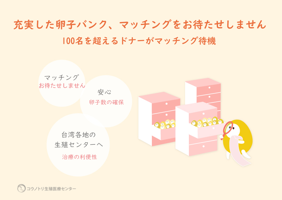 卵子提供をご検討のご夫婦の中には、「提供者とのマッチングまでに何ヶ月、あるいは何年も待たなければならないのでは…」とご不安を抱かれる方も少なくありません。コウノトリでは卵子バンクを有しており、現在100名以上の思いやりある卵子ドナーがマッチングを待っています。これにより、すぐに健康な卵子とのマッチングが可能となり、書類の準備が整い次第、移植のタイミングはレシピエントの都合に合わせて決めることができます。また卵子バンクは卵子数が確保されているため、卵子が足りずに移植ができないといった事態も防ぐことができます。