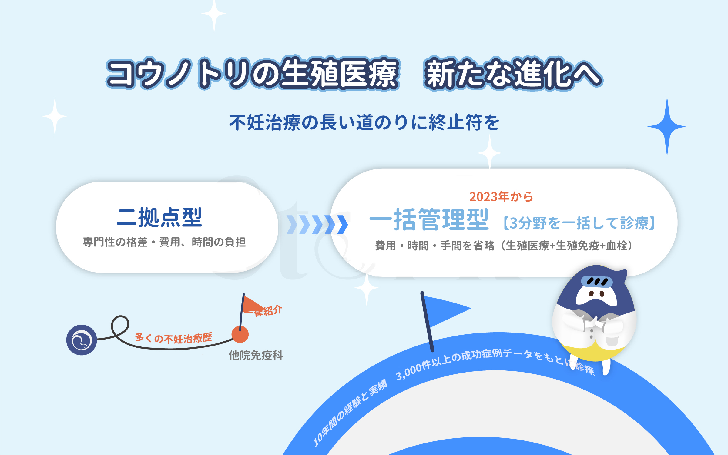 | 主治医 | 生殖医師から免疫医師へ紹介 | 生殖医師が免疫+血栓の専門性を兼ね備える |